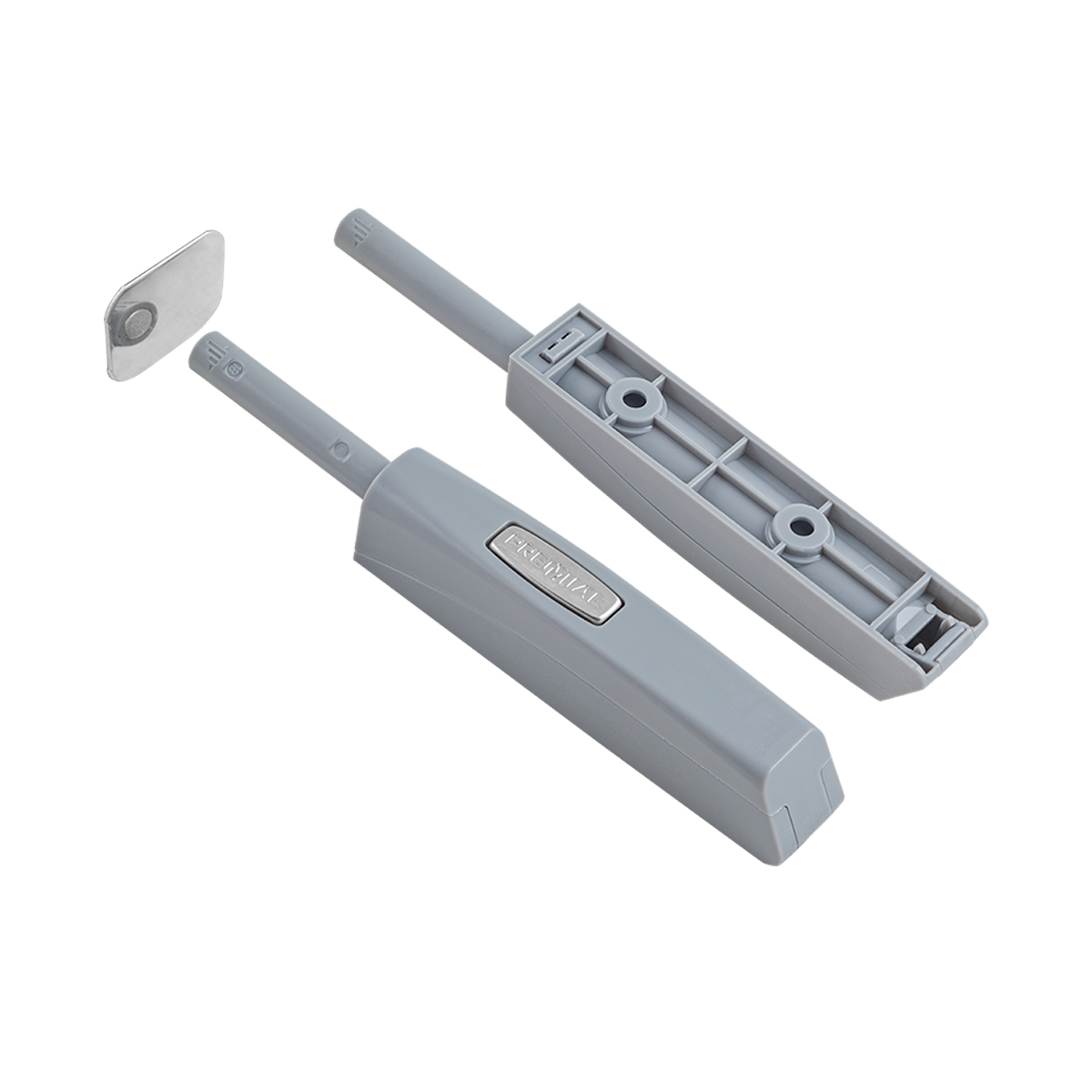 Толкатель с магнитным наконечником под фасады без ручек, устанавливается с петлями без пружин или с пружинами обратного действия. Позволяет оттолкнуть фасад на 35-40 мм для дальнейшего открытия.