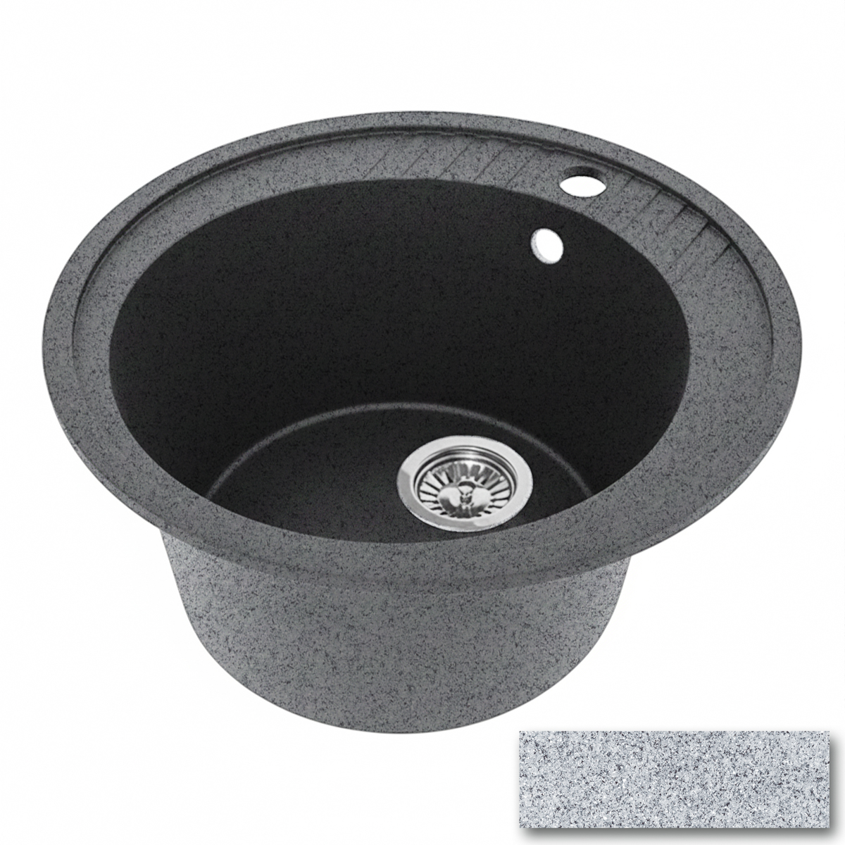 Каменная мойка диаметром 505 мм с круглой чашей диаметром 398 мм. Глубина мойки 180 мм при высоте мойки 200 мм. Диаметр сливного отверстия 116 мм. Мойка упакована в пакет и картонную коробку с маркировкой. Логотип размещен на шильдике в чаше мойки. Мойка представлена в 6 матовых и 6 глянцевых цветах. Вес изделия 12,3 кг.
