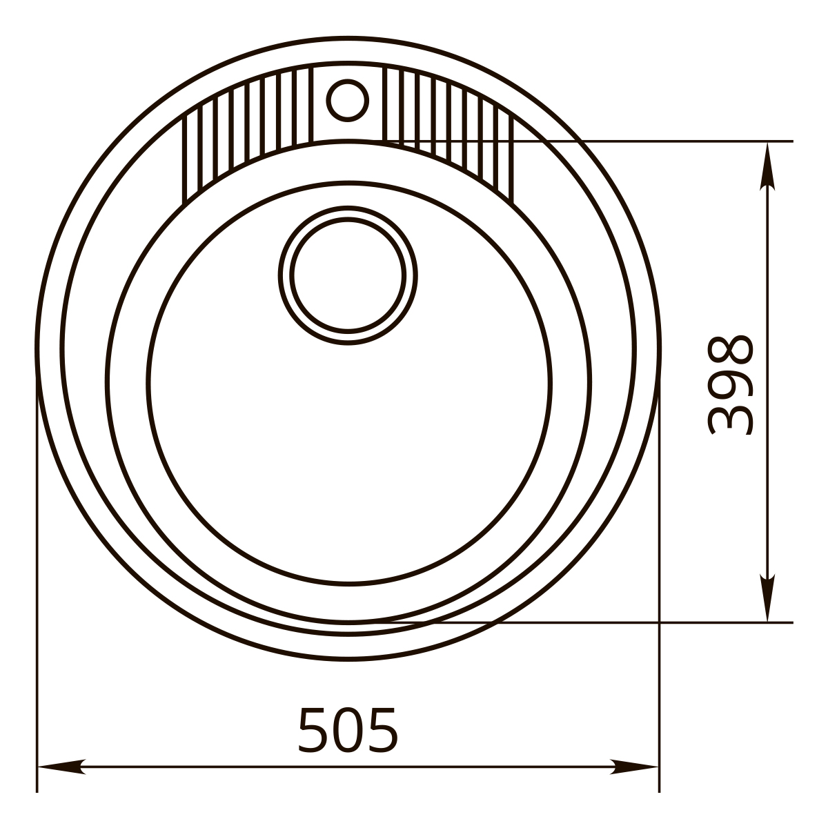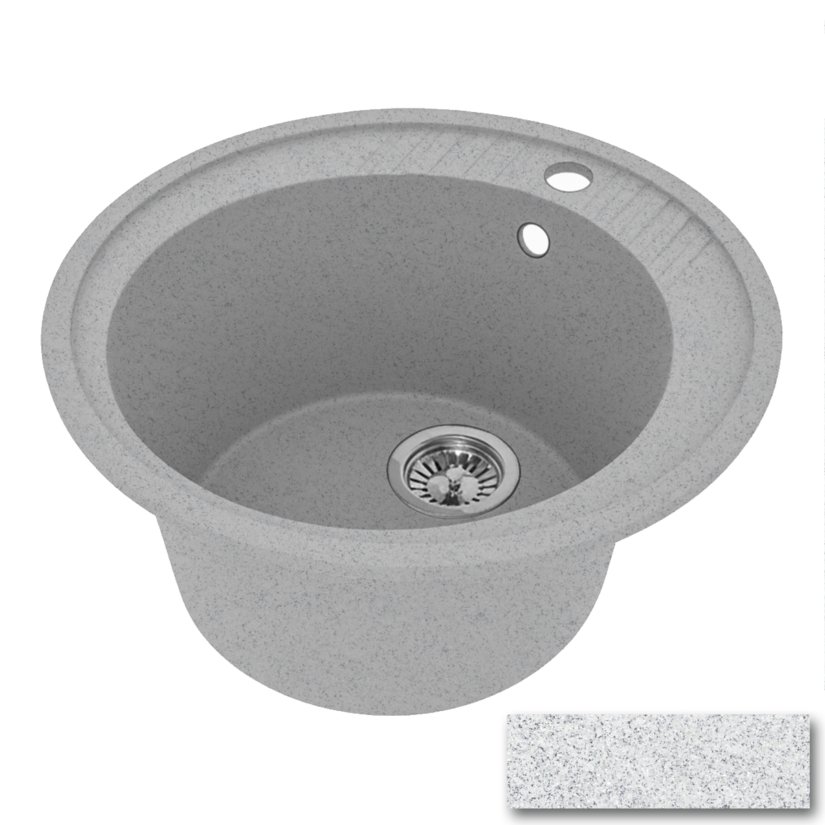 Каменная мойка диаметром 505 мм с круглой чашей диаметром 398 мм. Глубина мойки 180 мм при высоте мойки 200 мм. Диаметр сливного отверстия 116 мм. Мойка упакована в пакет и картонную коробку с маркировкой. Логотип размещен на шильдике в чаше мойки. Мойка представлена в 6 матовых и 6 глянцевых цветах. Вес изделия 12,3 кг.