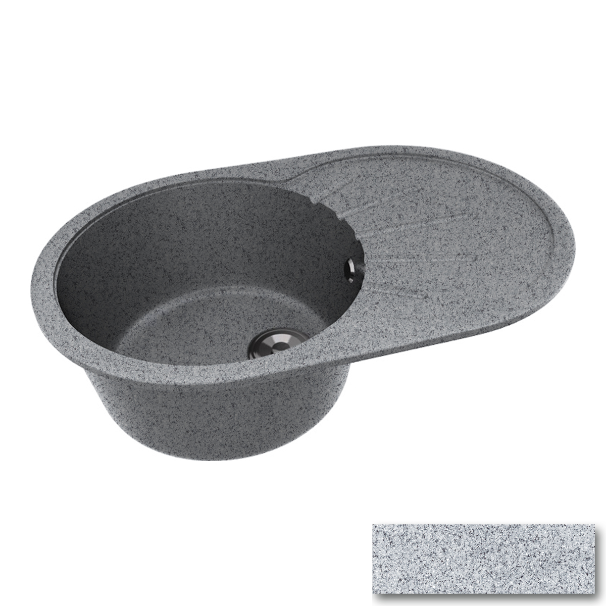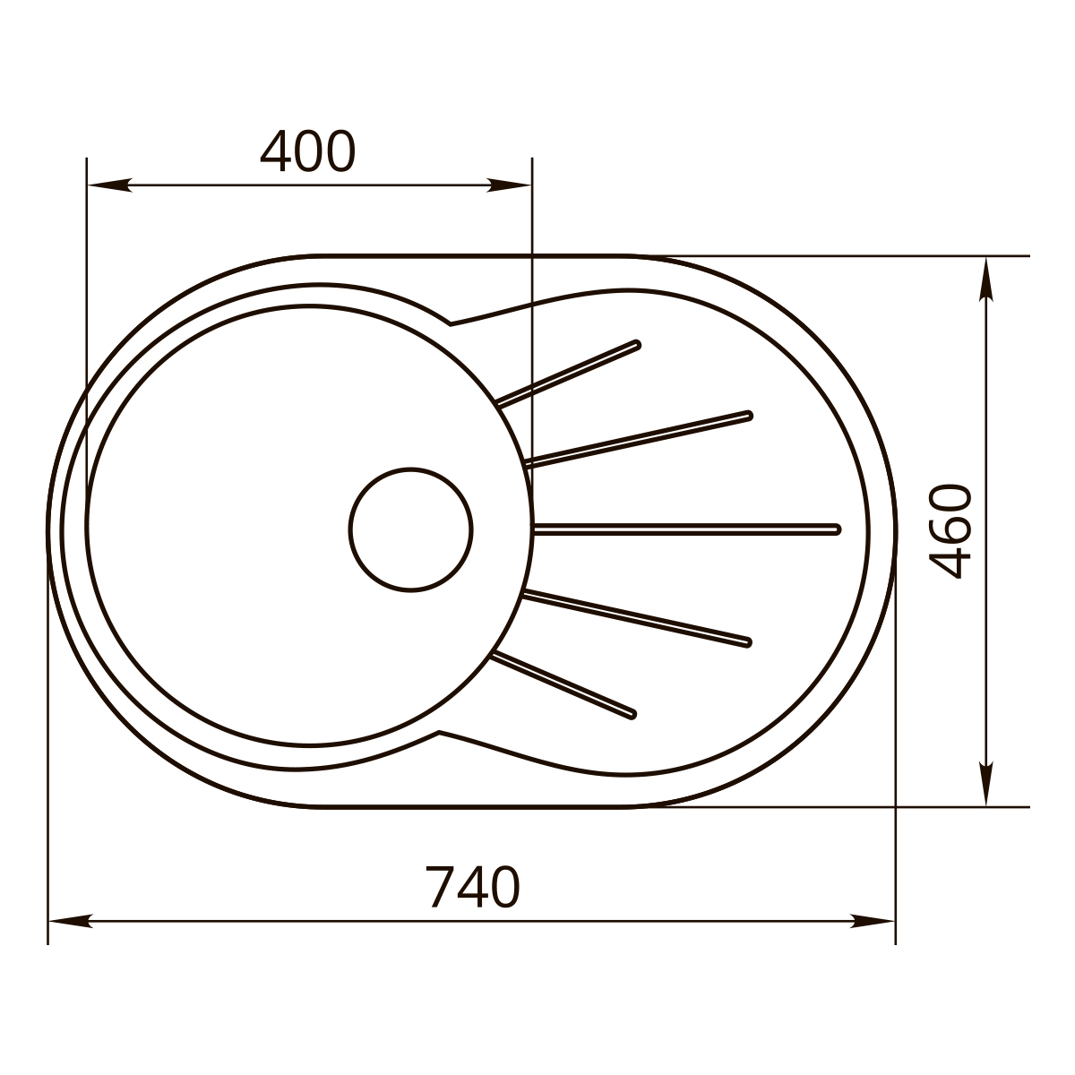 Широкая овальная мойка 740х460 мм с круглой чашей диаметром 400 мм. Высота мойки 210 мм, глубина чаши 190 мм, диаметр сливного отверстия 116 мм. На крыле мойки — рельеф в виде расходящихся лучей. Мойка представлена в 6 матовых и 6 глянцевых цветах.