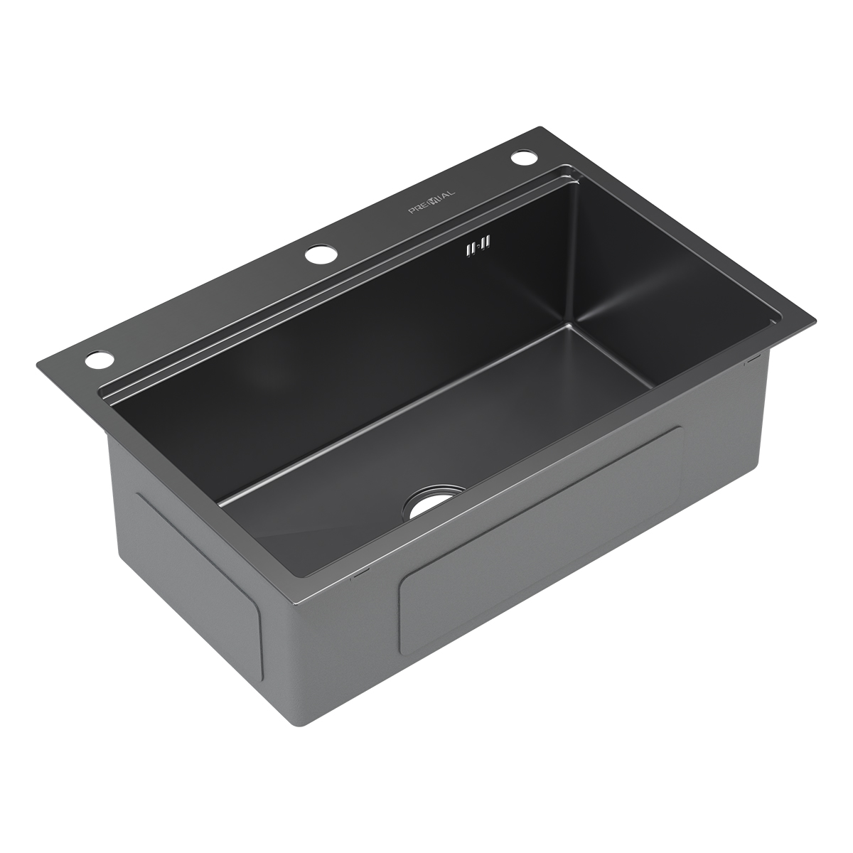 Мойка из пищевой нержавеющей стали 3 мм, размером 680х450 мм выполнена вручную. Размер чаши 630х350 мм. Дно сварное «конвертом», корпус в шумопоглощающей обливке серого цвета из натуральных пигментов и нейтральных полимеров. Сделано одно отверстие под смеситель, два дополнительных отверстия для дозатора/крана питьевой воды. У мойки комфортная глубина 220 мм, снижающая разбрызгивание воды, малый радиус скругления углов чаши — для большей вместимости.