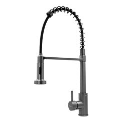 Современный смеситель для кухни с гибким изливом на пружине и вытяжной лейкой, оснащенной кнопкой для переключения режимов струи. Управление осуществляется одним рычагом.