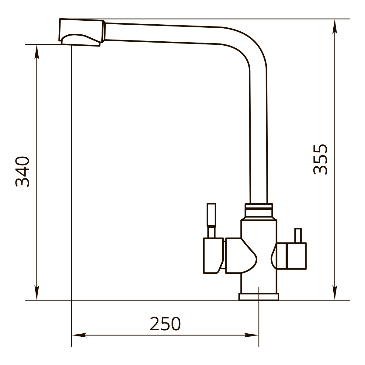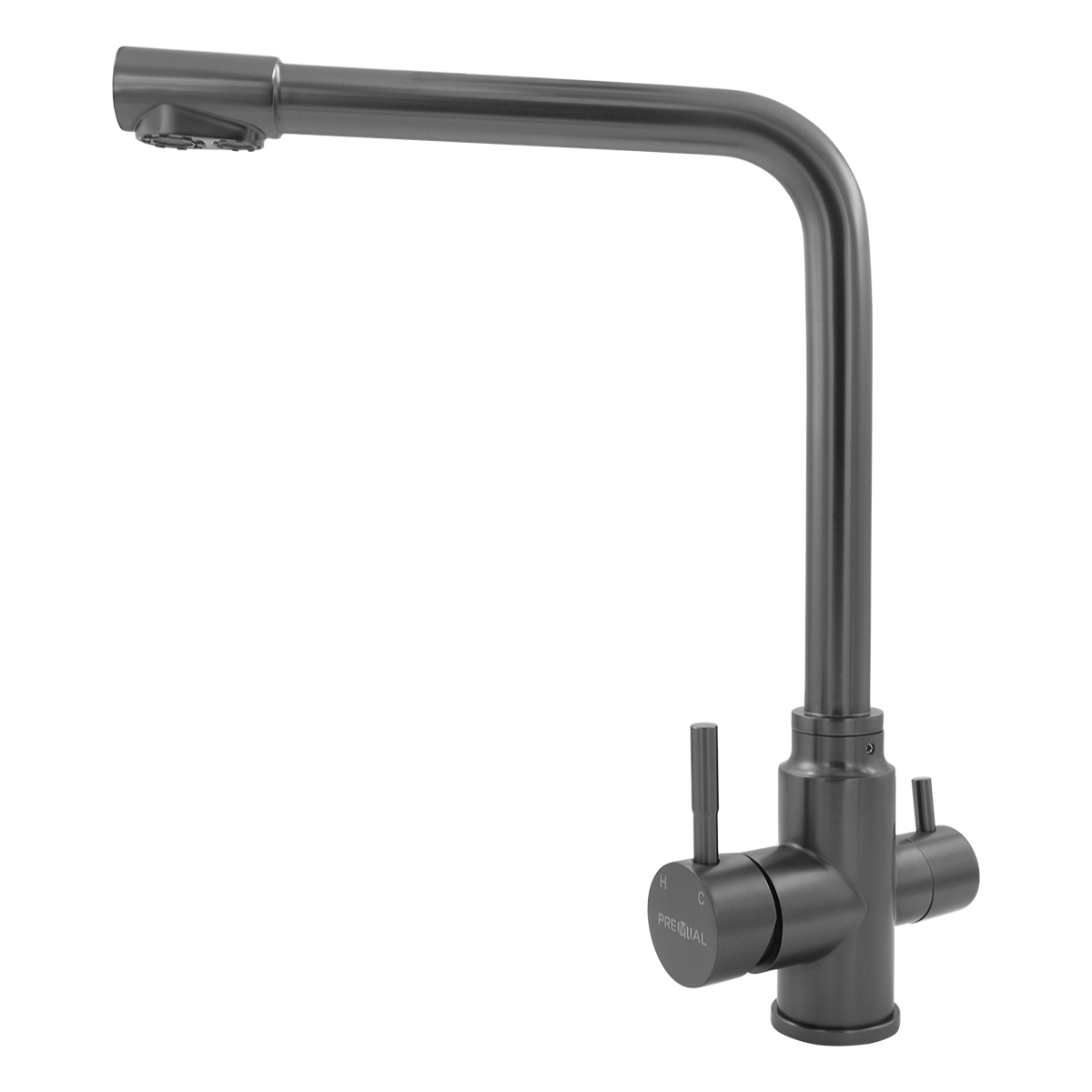 Комбинированный смеситель для водопроводной и фильтрованной воды из коллекции «Чистая вода» (двухрычажные смесители). В прямоугольном изливе с углом 90гр. в параллельных изолированных каналах вода из разных источников не смешивается.