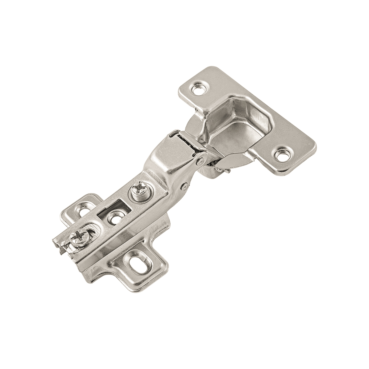 Петля полунакладная с чашкой 35 мм, имеет механизм надвижного монтажа slide-on и регулировочный винт. Данный вид петли необходим, когда в мебели используются смежные двери, где два фасада крепятся с двух сторон от перегородки корпуса шкафа. Расстояние между отверстиями в чашке петли 48мм. Оптимальны для использования в мебели класса ЭКОНОМ.