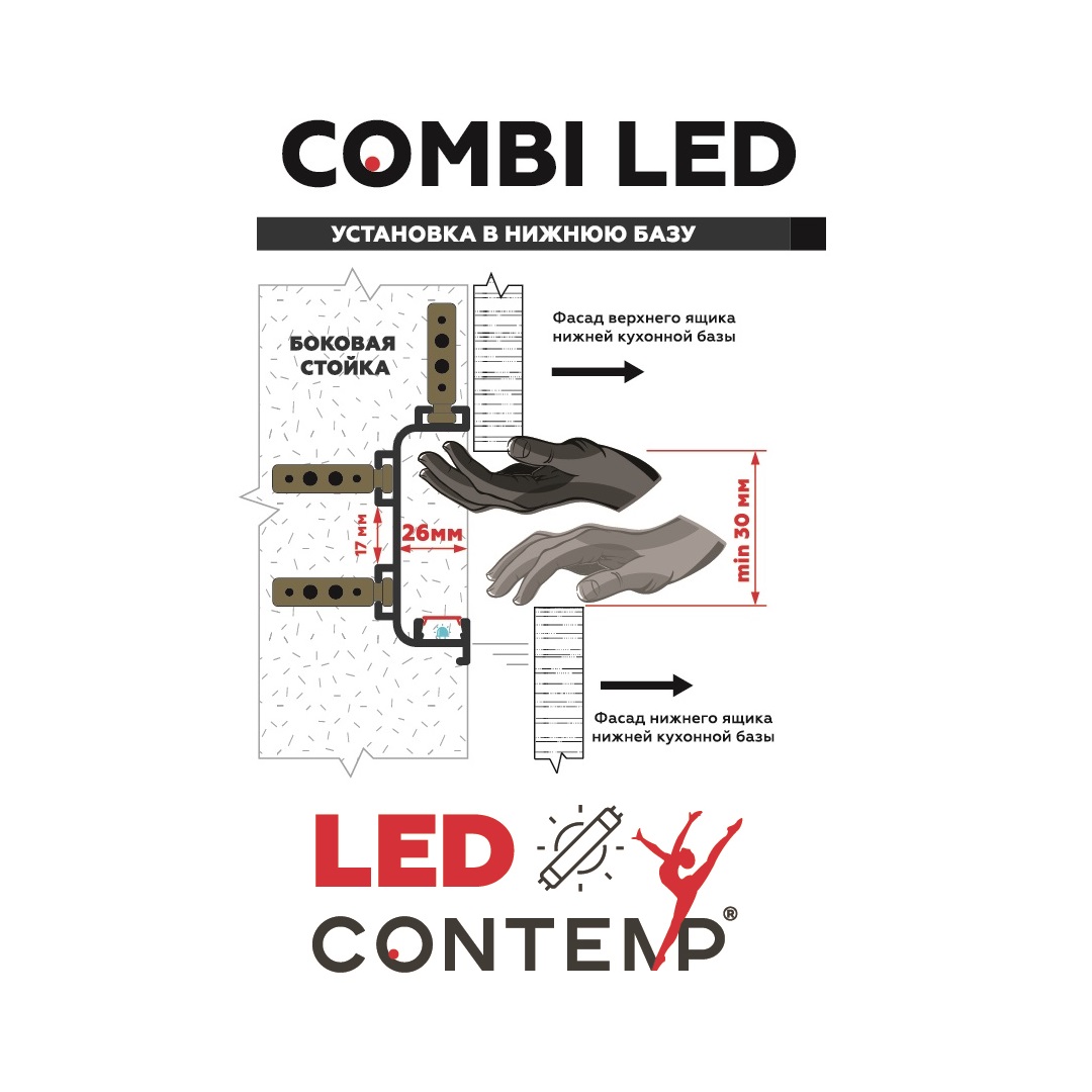 Профиль Gola Contemp® Combi LED горизонтальный/вертикальный с двумя закруглениями универсального использования в декоре Черный анод — в нижнюю кухонную базу (горизонтально/вертикально за 2 фасада), в верхнюю кухонную базу (за 2 фасада вертикально/горизонтально) или в колонну (вертикально/горизонтально за 2 фасада).