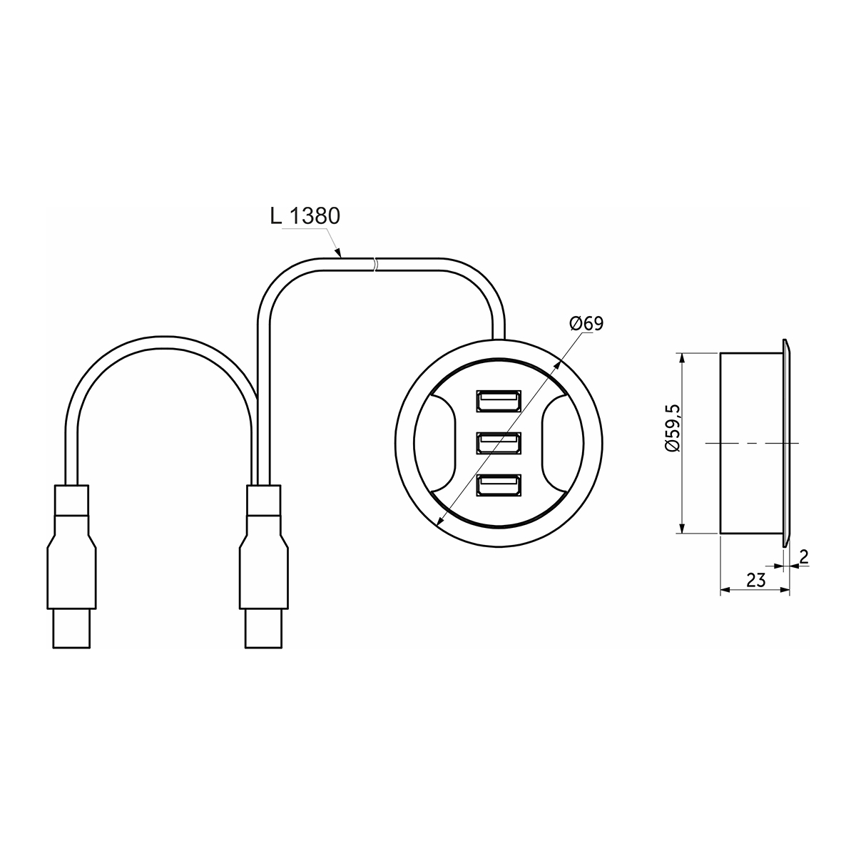 Напряжение 5V. Диаметр врезного отверстия 60мм. Длина кабеля 1420мм.