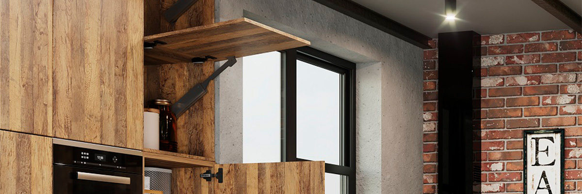 Подъемник не оказывает давление на петли, а в комплекте уже есть все необходимые крепления к корпусу и к фасаду. Фасад откидывается вверх, почти в горизонтальное положение (с углом открывания 100°).