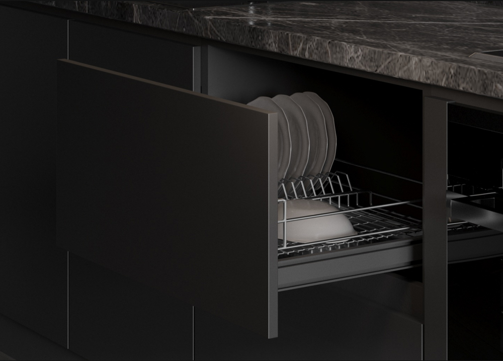 - LARGO оснащён направляющими скрытого монтажа полного выдвижения с доводчиком, поэтому доступ к посуде удобен даже в дальних зонах ящика – ничего не нужно «вылавливать» на ощупь. А доводчик обеспечивает мягкое закрывание без ударов – так, как должно быть в современной кухне.