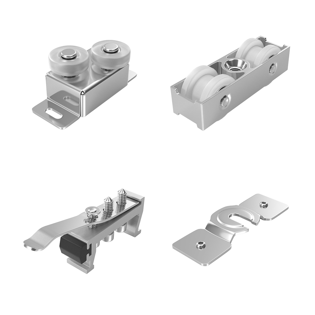 1. Верний двухосный ролик - 2 шт. Ролик со звукозащитными прокладками для плавного скольжения раздвижной двери в подвесной системе. Толщина стальных стенок — 2,2 мм, колеса из стойкого на стирание и деформации РОМ-термопласта. Ролики состоят из корпуса с колесами, крепежной оси и монтажной площадки. У верхних роликов практически бесшумный, легкий ход: в крепежное отверстие интегрирована полимерная звукопоглощающая прокладка.