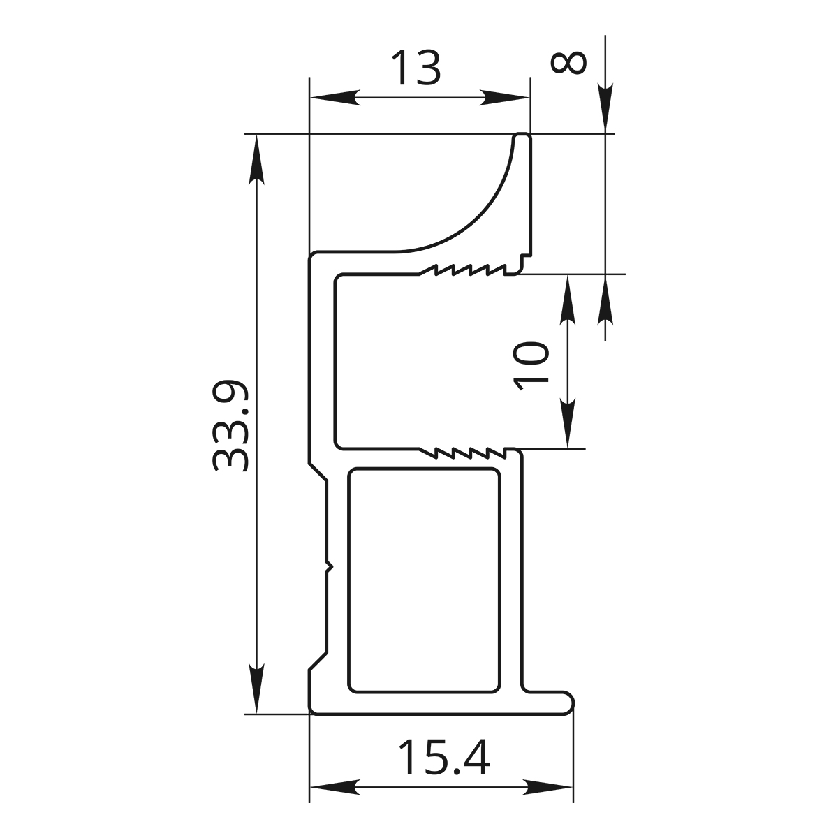 Вертикальный профиль Elephant FOX рамповидной формы с видимой шириной 13 мм используется в качестве ручки в раздвижной узкорамочной системе Elephant и навесной системе AluForce.