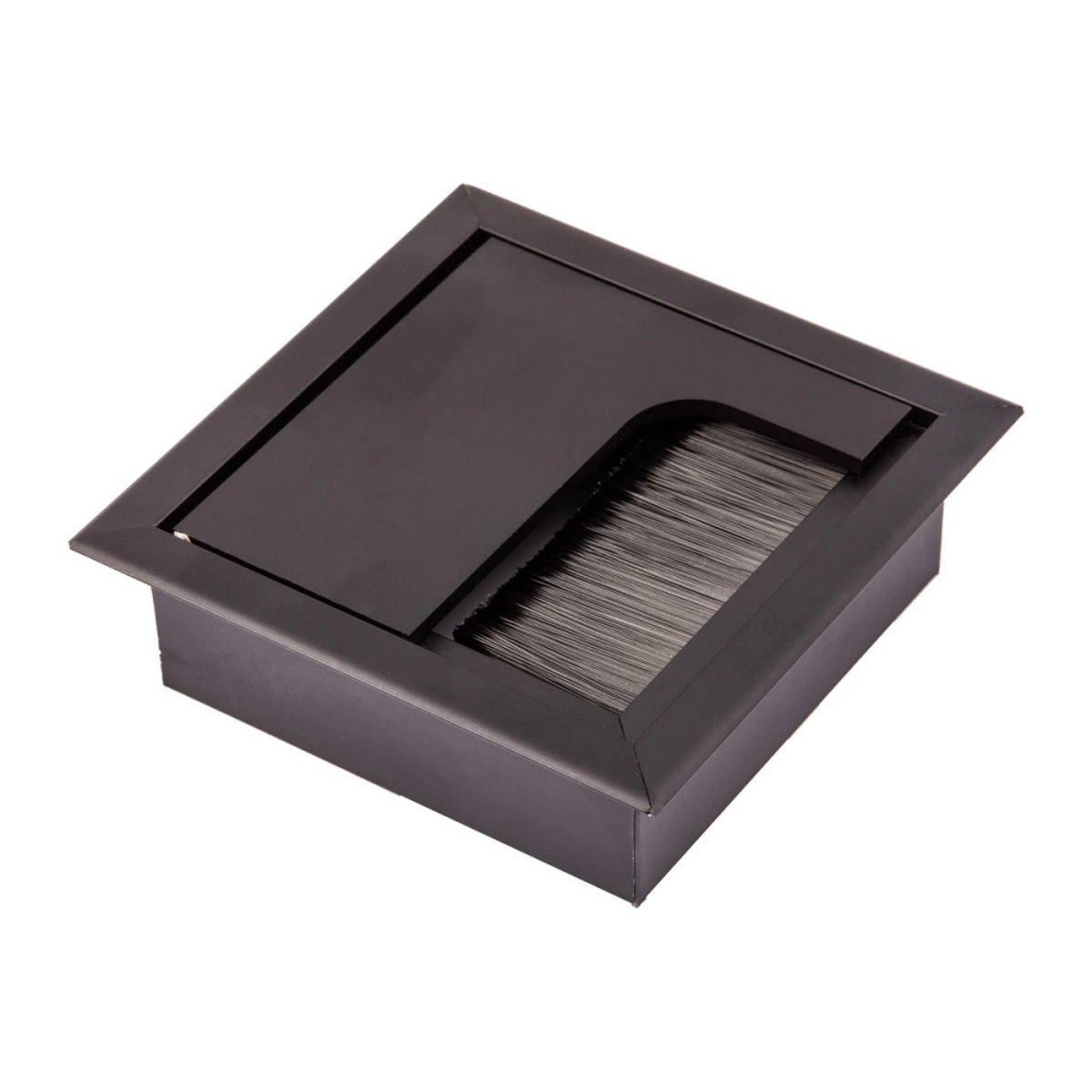 Пропуск кабельный врезной. Габаритные размеры изделия 80х80 мм, размеры отверстия в столешнице - 68,5х68,5мм. Внутри пропуска есть щетка + откидная крышка, которая частично закрывает отверстие для кабеля.