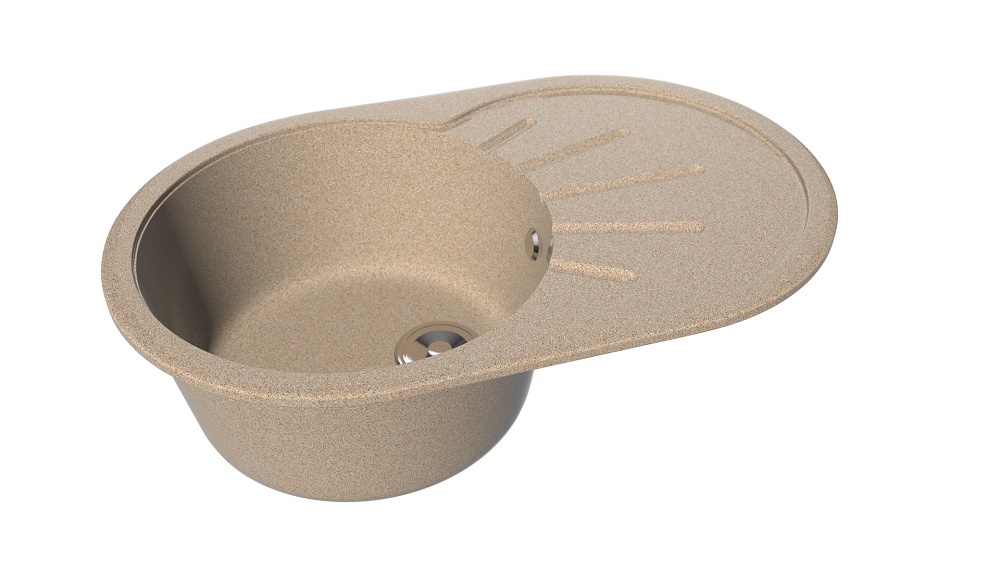Широкая овальная мойка 455х735 мм с круглой чашей диаметром 390 мм. Высота мойки 170 мм, глубина чаши 150 мм, диаметр сливного отверстия 116 мм. На крыле мойки — рельеф в виде расходящихся лучей. Мойка представлена в 7 матовых и 7 глянцевых цветах.я