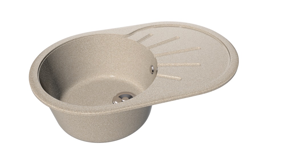 Широкая овальная мойка 455х735 мм с круглой чашей диаметром 390 мм. Высота мойки 170 мм, глубина чаши 150 мм, диаметр сливного отверстия 116 мм. На крыле мойки — рельеф в виде расходящихся лучей. Мойка представлена в 7 матовых и 7 глянцевых цветах.
