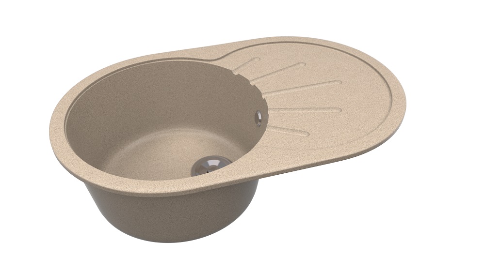 Широкая овальная мойка 455х735 мм с круглой чашей диаметром 390 мм. Высота мойки 170 мм, глубина чаши 150 мм, диаметр сливного отверстия 116 мм. На крыле мойки — рельеф в виде расходящихся лучей. Мойка представлена в 7 матовых и 7 глянцевых цветах.
