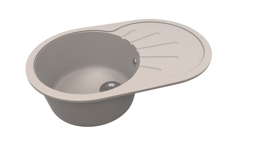 Широкая овальная мойка 455х735 мм с круглой чашей диаметром 390 мм. Высота мойки 170 мм, глубина чаши 150 мм, диаметр сливного отверстия 116 мм. На крыле мойки — рельеф в виде расходящихся лучей. Мойка представлена в 7 матовых и 7 глянцевых цветах.