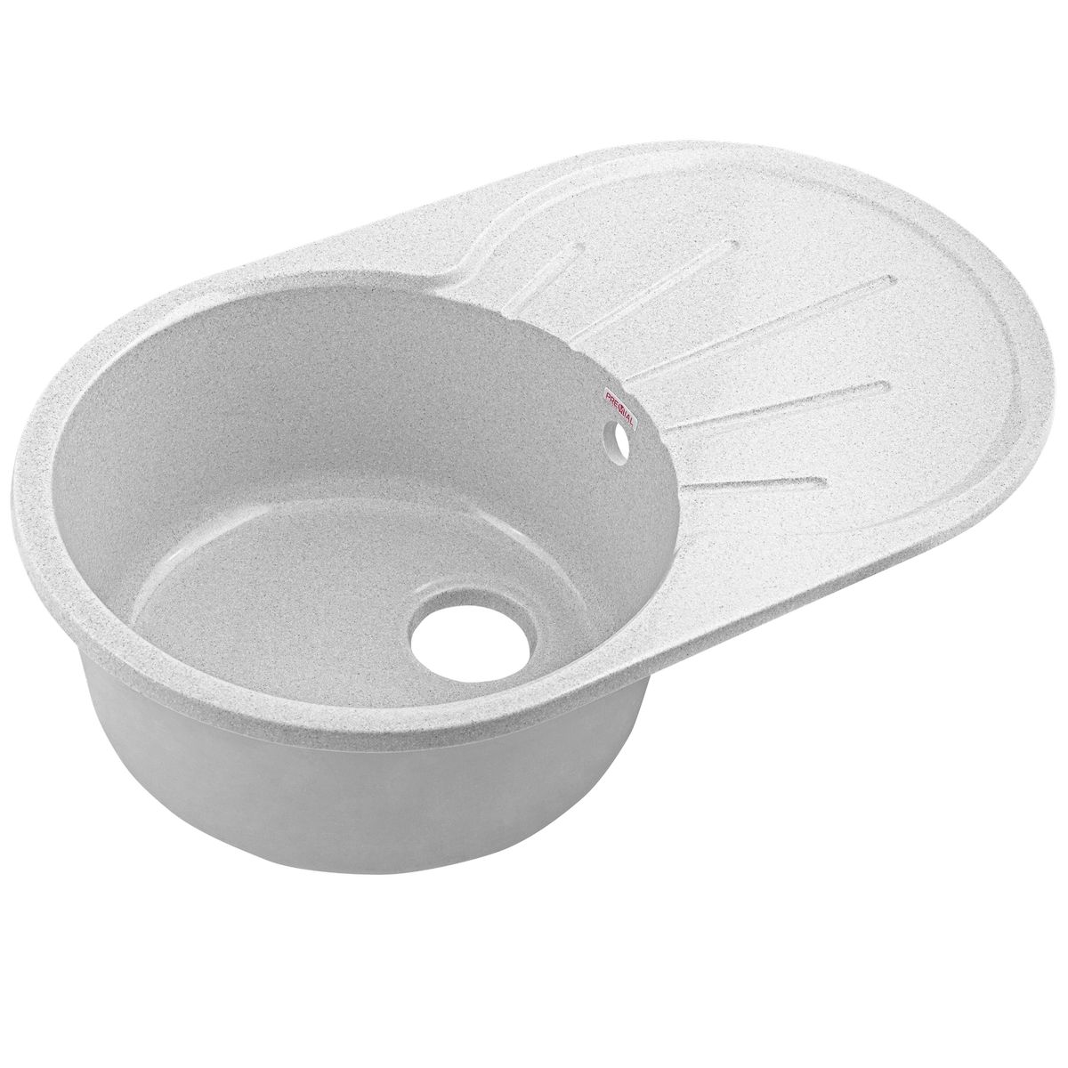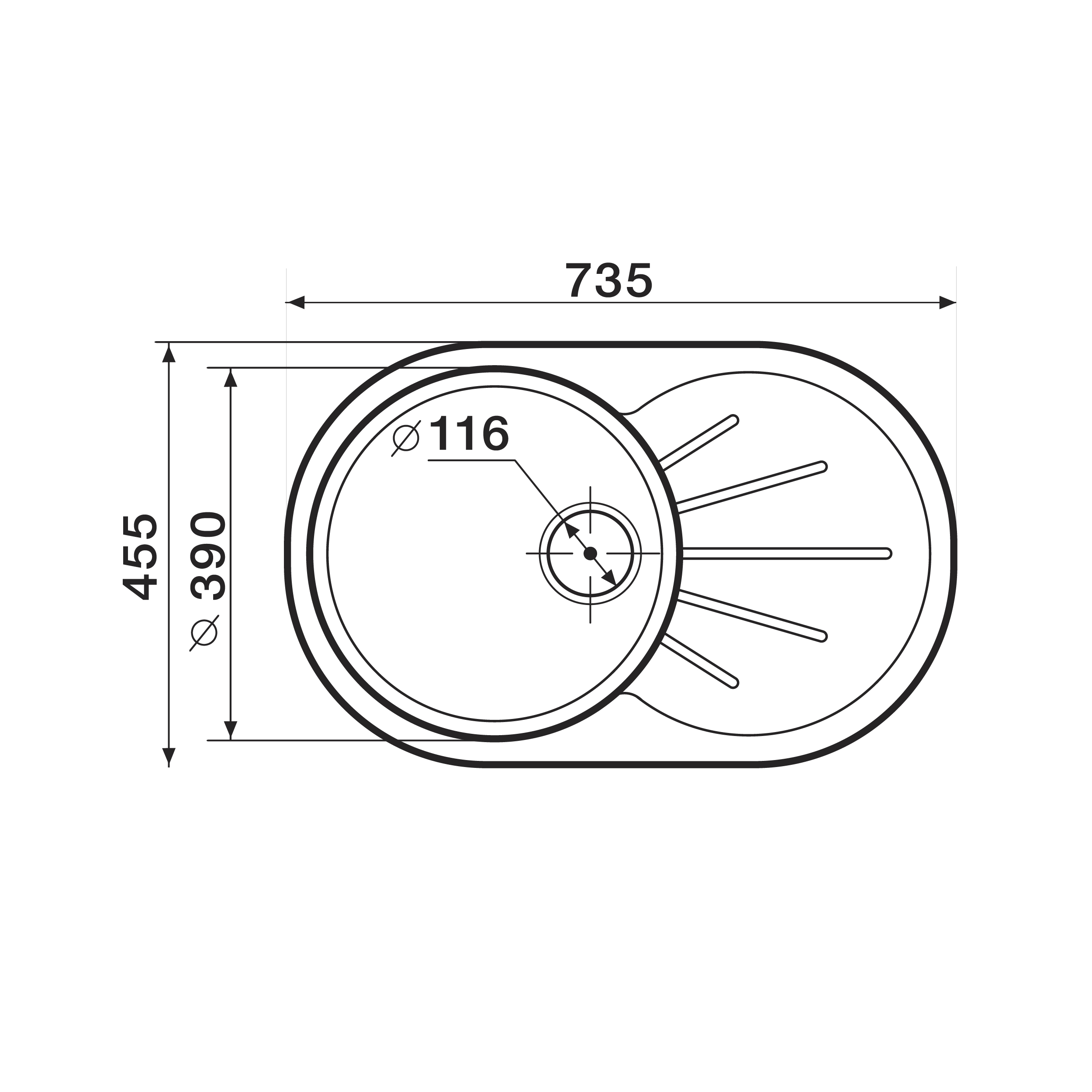 Широкая овальная мойка 455х735 мм с круглой чашей диаметром 390 мм. Высота мойки 170 мм, глубина чаши 150 мм, диаметр сливного отверстия 116 мм. На крыле мойки — рельеф в виде расходящихся лучей. Мойка представлена в 7 матовых и 7 глянцевых цветах.