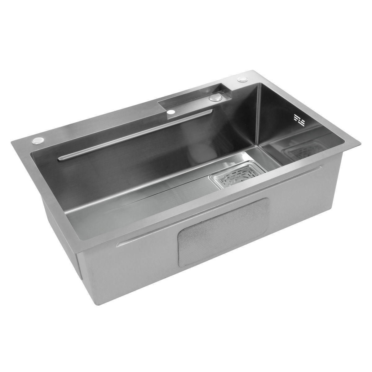 Мойка из пищевой нержавеющей стали SUS304 3 мм, размером 720*450 мм со сложным рельефом дна и трехступенчатым инженерным сливом. Глубина мойки 220 мм. В комплекте смеситель, встроенный душ. На надкрылке имеется прямоугольное отверстие для смесителя, дополнительное отверстие для дозатора.