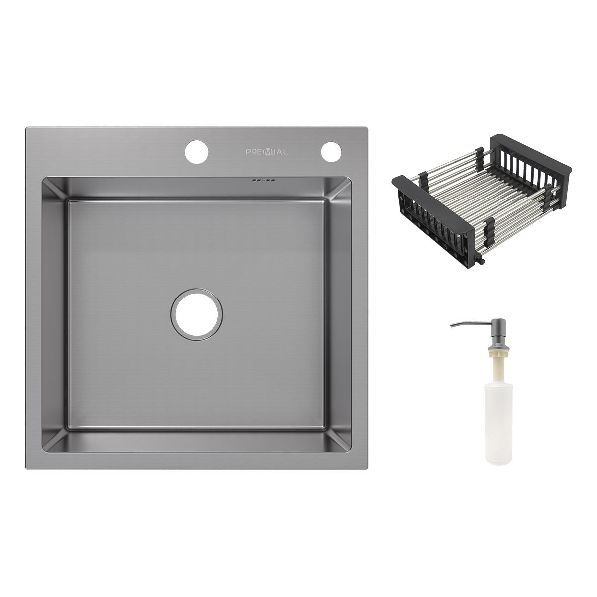Кухонная мойка полностью ручной работы из нержавеющей стали до 3 мм, дно сварное, в форме «конверта», корпус обливают шумопоглощающим составом серого цвета. Общие габариты мойки 500х500 мм, глубина чаши 220 мм, размер 450х400 мм. Вес нетто 5,7 кг, вес брутто 8,3 кг. В центре надкрылка одно отверстие под смеситель, в правом углу — одно отверстие под дозатор. В стандартном варианте комплектации в качестве аксессуаров к мойке идет телескопическая корзина-коландер Kit из стального прутка на пластиковых держателях и дозатор для жидких моющих средств Cherry.