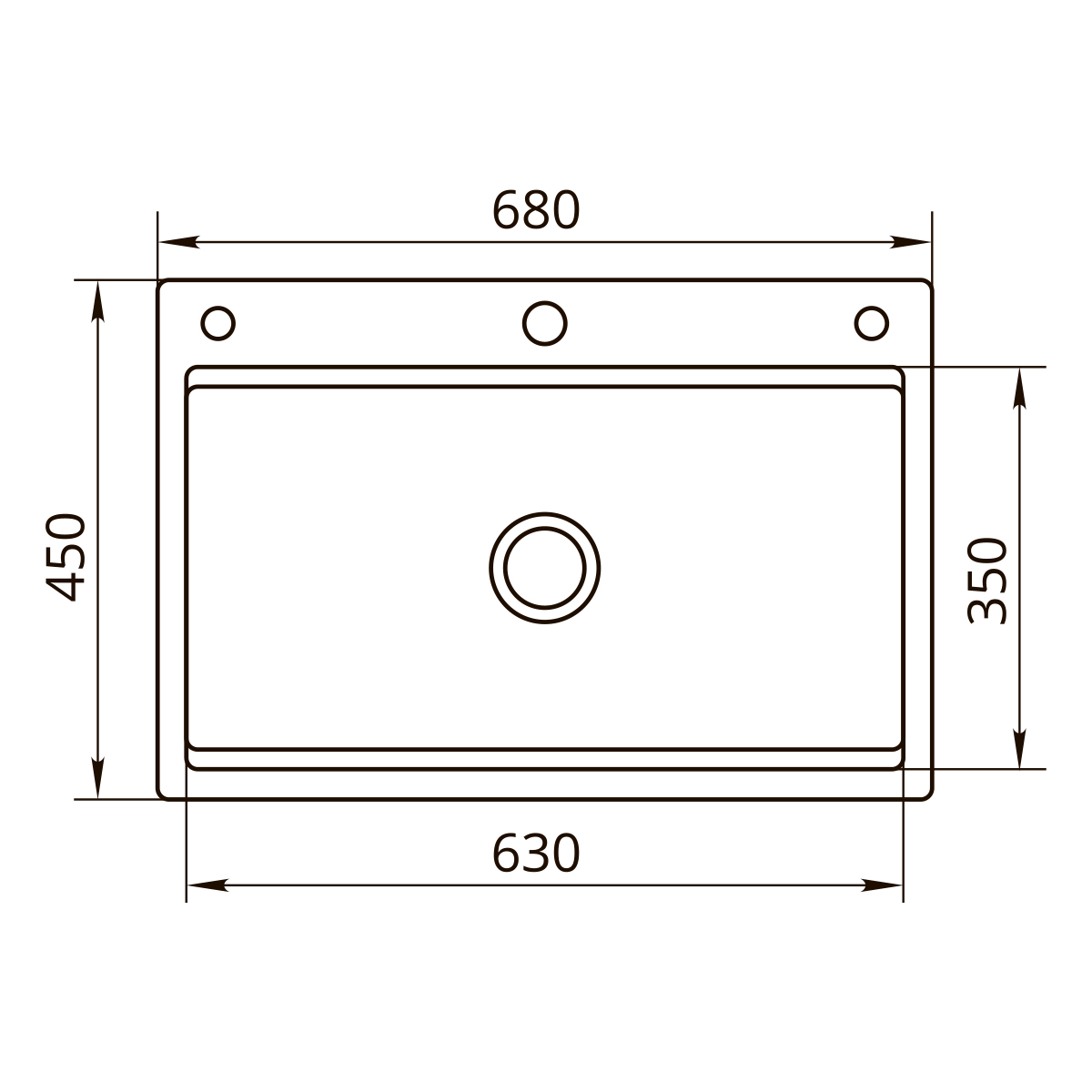 Мойка из пищевой нержавеющей стали 3 мм, размером 680х450 мм выполнена вручную. Размер чаши 630х350 мм. Дно сварное «конвертом», корпус в шумопоглощающей обливке серого цвета из натуральных пигментов и нейтральных полимеров. Сделано одно отверстие под смеситель, два дополнительных отверстия для дозатора/крана питьевой воды. У мойки комфортная глубина 220 мм, снижающая разбрызгивание воды, малый радиус скругления углов чаши — для большей вместимости.