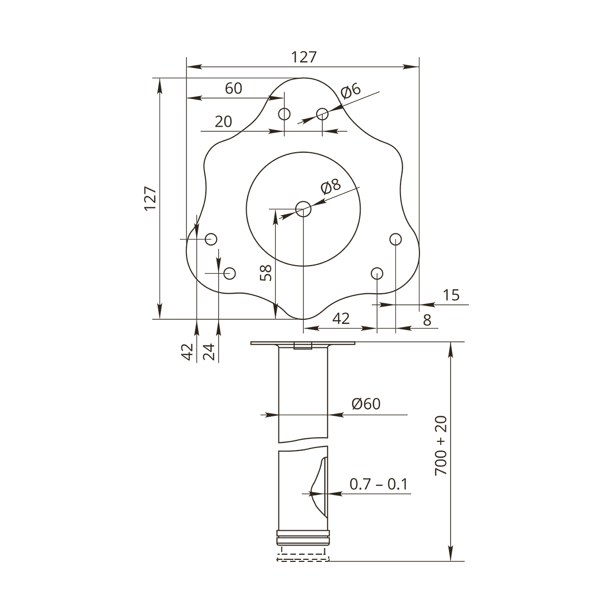 У опоры стандартные размеры: высота 710 мм, диаметр 60 мм. Толщина крепления — 1,2 мм. Регулировка по высоте (в пределах наращивания) до 20 мм.