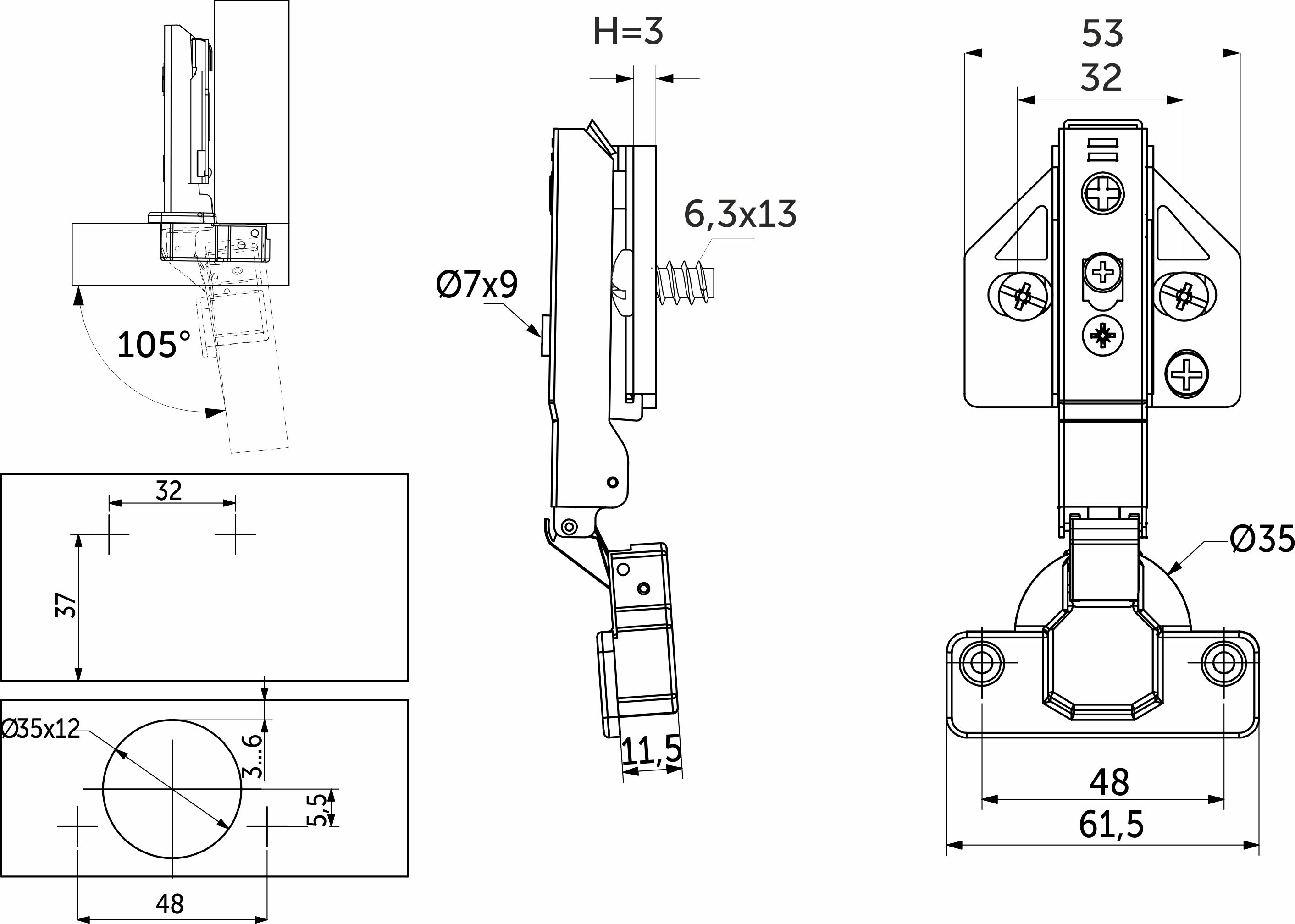 Петля мебельная накладная с доводчиком и системой быстрого монтажа clip on. Имеет современную систему регулировки в трех плоскостях по +/-2-4 мм при помощи эксцентриковых винтов в планке и теле петли. межцентровое расстояние в чашке 45 мм и 48 мм. Петля имеет массу 105 грамм и изготовлена из высокопрочной холоднокатаной стали. Имеет встроенный демпфер, что обеспечивает плавность закрытия петли, и два угла открывания на 75 и 105 градусов. В комплекте идут декоративные накладки на тело и на чашку для маскировки винтов крепления.