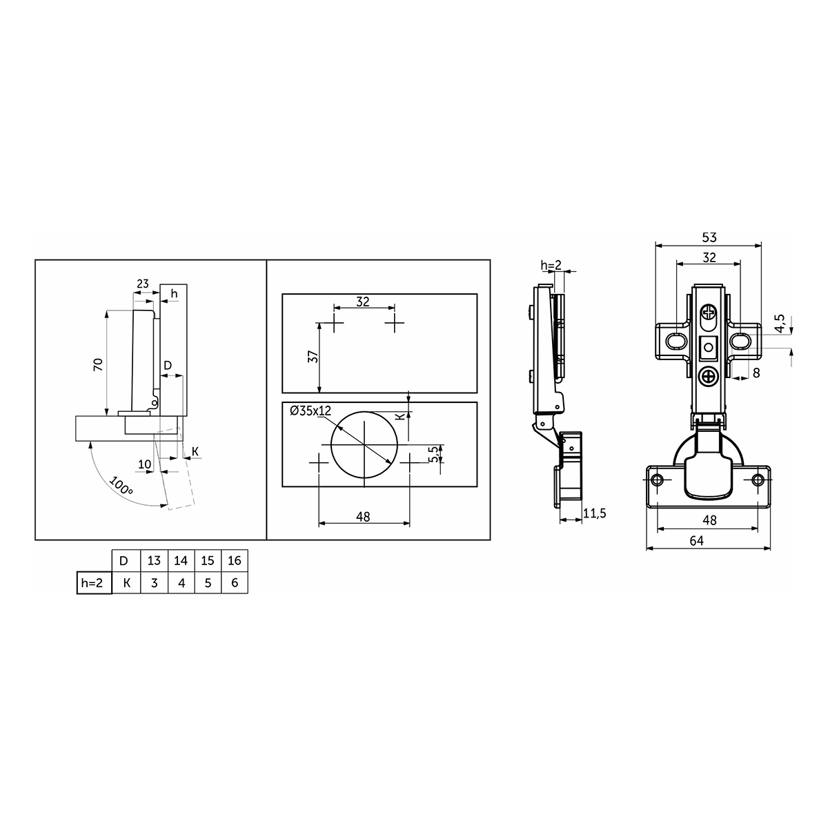 Изготовлена из холоднокатанной стали. Диаметр чашки петли составляет ∅35 мм. Глубина чашки 11,5 мм. Глубина сверления, необходимая для установки, 12 мм.