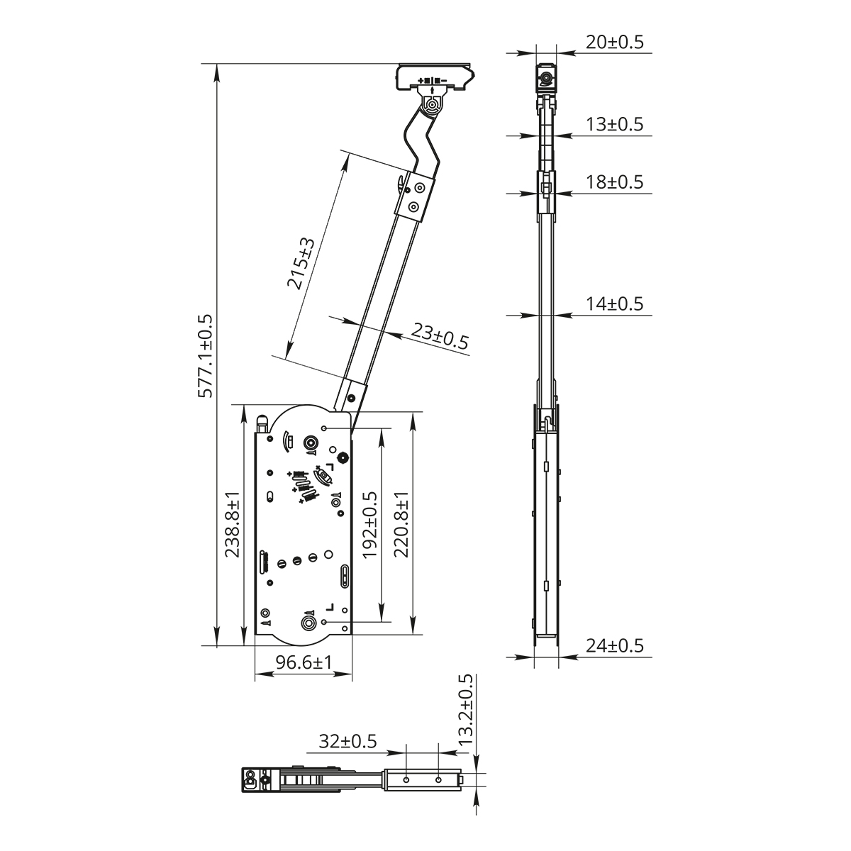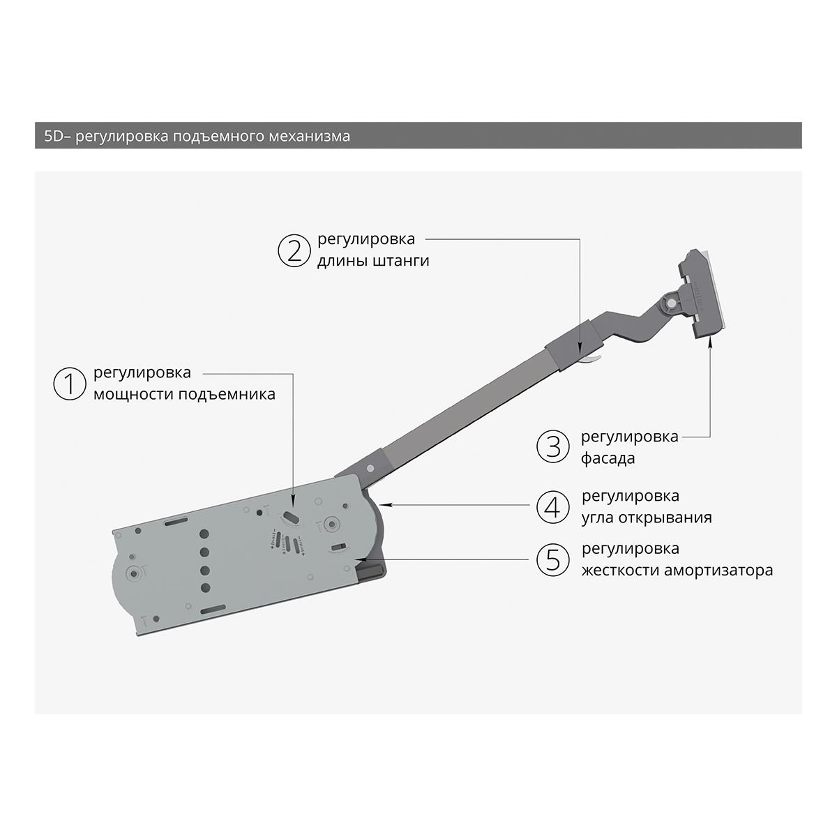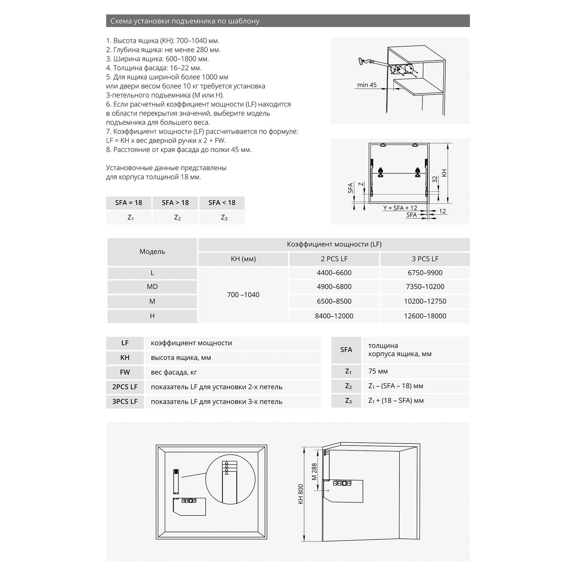 Подъемный механизм с регулировкой мощности и длины рычага предназначен для установки на ящики с двойным (ломающимся) фасадом и открытием вверх. Имеет регулировки в трех плоскостях для выравнивания фасадов и регулировки усилий. В комплекте имеются все необходимые петли, 2 механизма, демпфера, крепления к фасаду, саморезы, шаблон. Имеет крепления Clip on к фасаду и корпусу ящика для удобного и быстрого монтажа / демонтажа фасада. Имеет функцию фиксации в любом положении и систему доводчика. что обеспечивает плавное и бесшумное закрытие.Также имеет телескопические штанги для универсального подбора под высокие фасады. Допустимые размеры по высоте фасада 700 - 1040 мм, ширине фасада до 1800 мм.