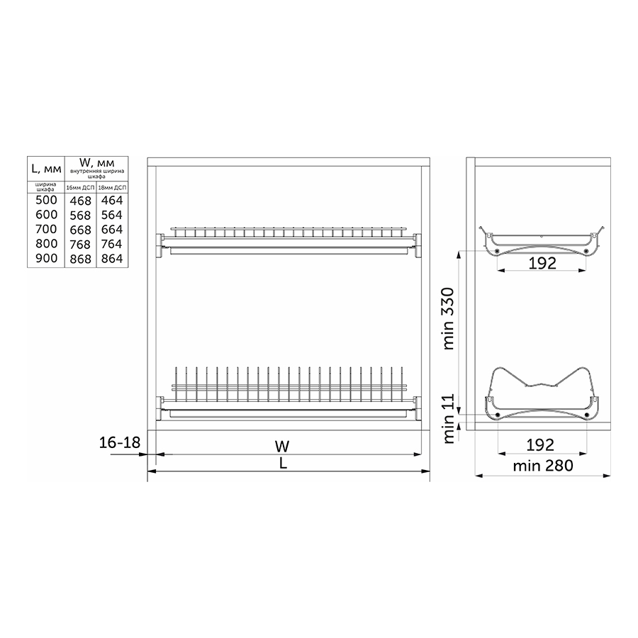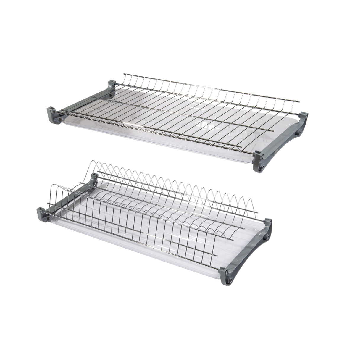В одном комплекте: сушка для чашек - 1 шт., сушка для тарелок - 1 шт., поддон пластиковый (прозрачный) - 2 шт., крепление пластиковое (серое)- 4шт., крепежный винт - 8 шт.