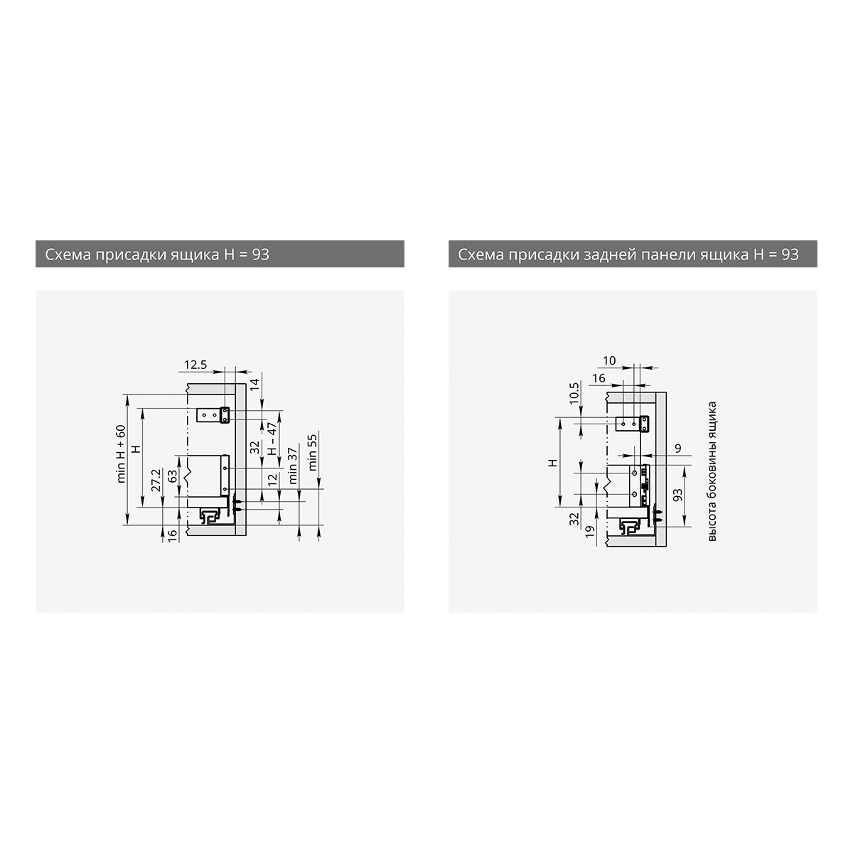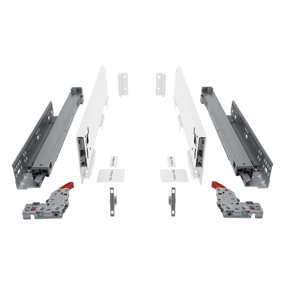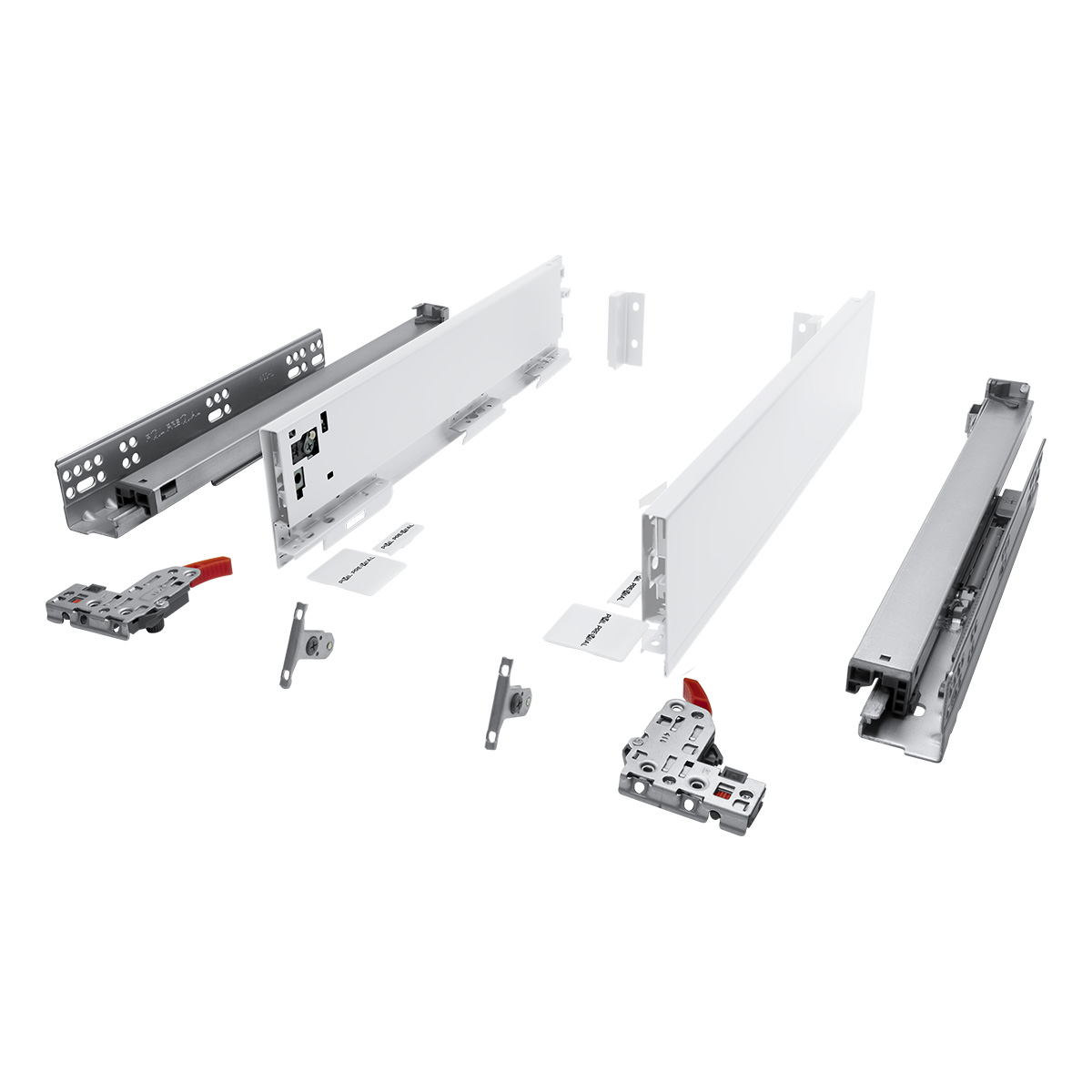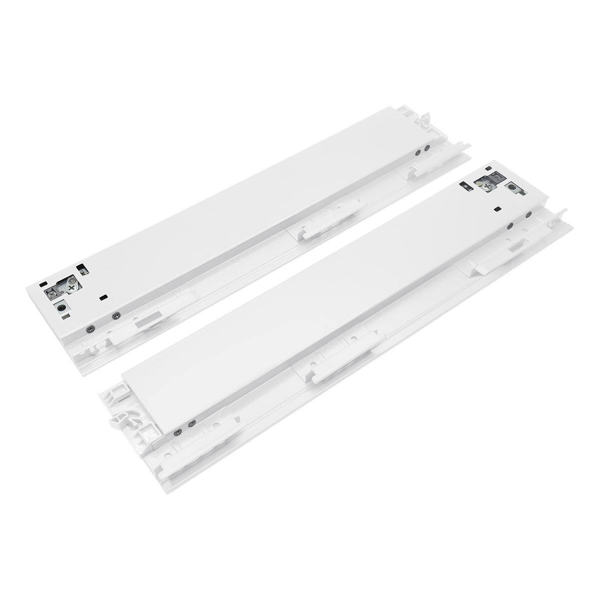 Под плиты 16 мм. Комплект системы выдвижения со стальными боковинами в высотах 93, 131, 178 мм. Доступны в белом цвете. В состав комплекта включена пара боковин, пара направляющих с фиксаторами, крепления фасада, заглушки, инструкция, крепления задней стенки. Для изготовления выдвижного ящика понадобится только самостоятельно изготовить дно ящика, заднюю стенку и фасад. Данный комплект ящика оснащен системой регулировки в пяти плоскостях для позиционирования фасада относительно корпуса и соседних фасадов. Регулировка вверх/вниз - 3мм, регулировка вправо/влево - 3мм, регулировка вперед/назад - 4мм, регулировка по высоте задней части ящика - 4мм, регулировка усилия доводчика: шаг 1 - увеличение усилия на 4%, шаг 2 - увеличение усилия на 8%, шаг 3 - увеличение усилия на 12%, шаг 4 - увеличение усилия на 15% .