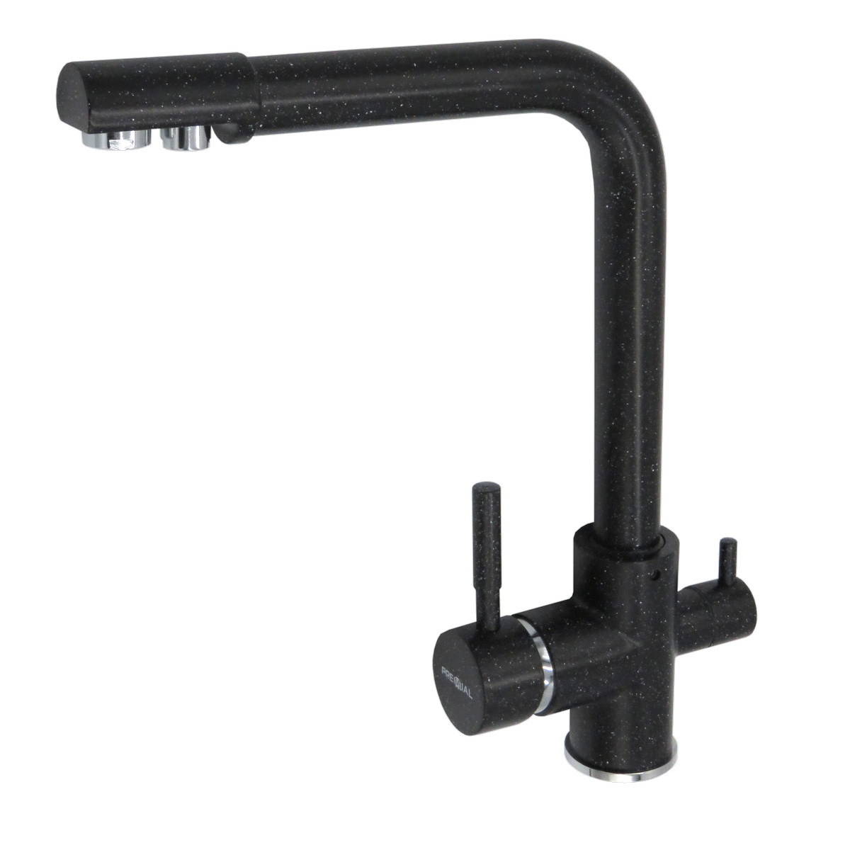 Кухонный комбинированный смеситель с высоким прямоугольным двойным изливом. Смеситель с двумя рычагами и двумя изолированными параллельно каналами для воды из водопровода и воды от фильтра. Корпус выполнен из латуни, излив стальной, круглый, поворотный. Сверху композитное покрытие из мраморной крошки.