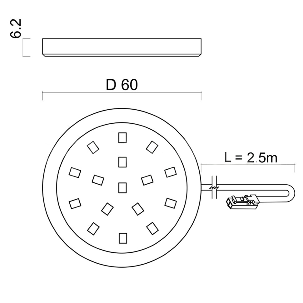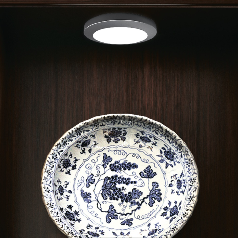 Светильник имеет тонкий - 6 мм и компактный корпус круглой формы, благодаря которому практически не занимает место внутри мебели. Легкий и удобный способ установки на двусторонний скотч или саморезы, не требует сверления отверстия.