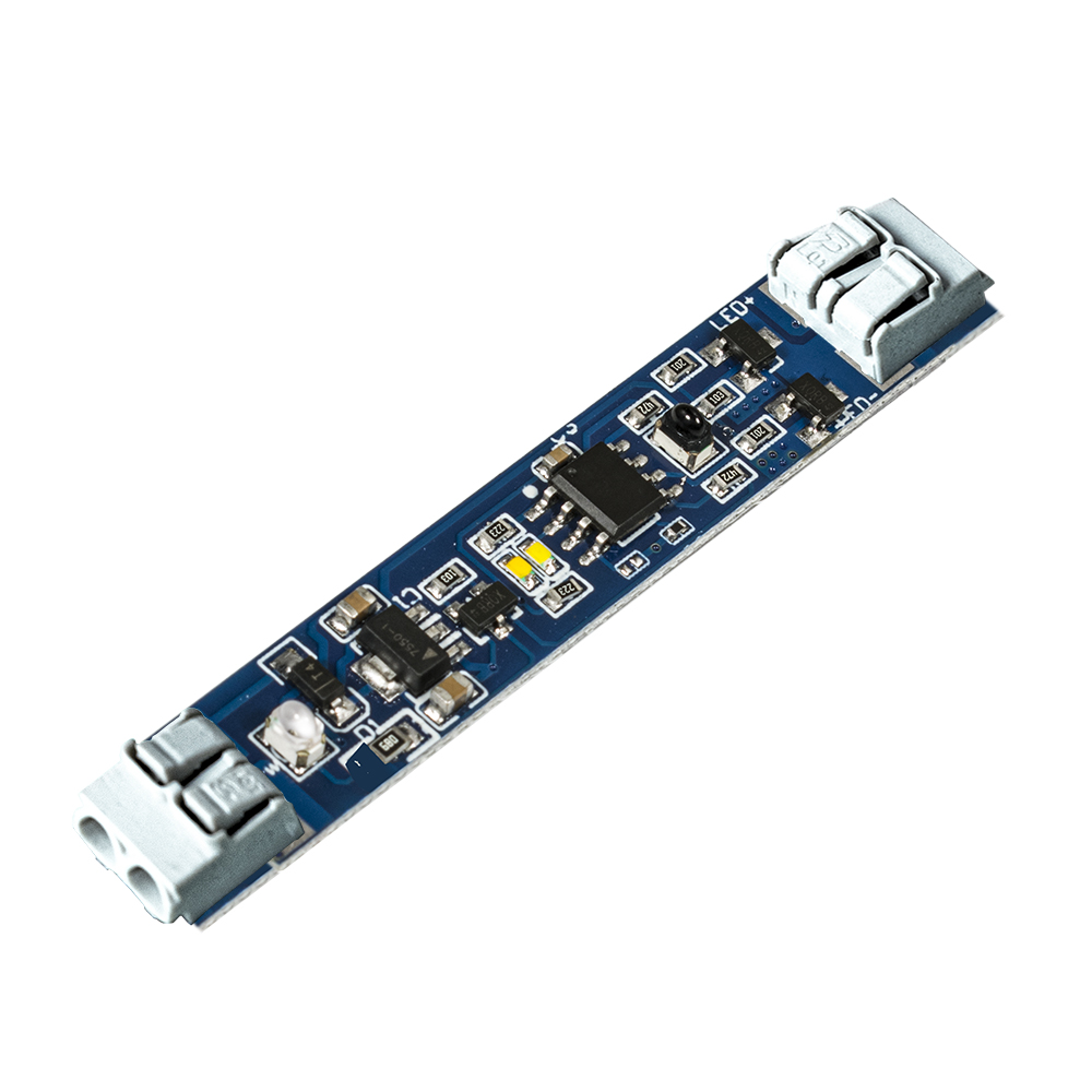 Сенсорный выключатель с терминалами предназначен для включения/отключения и диммирования светодиодных лент 12/24 В установленных в алюминиевый профиль. Устройство управляется без непосредственного физического контакта с помощью движения ладони и способно работать через светорассеивающий экран. Индикация осуществляется с помощью светодиода цветовой температурой 3000К в выключенном состоянии и 4000К во включенном состоянии.