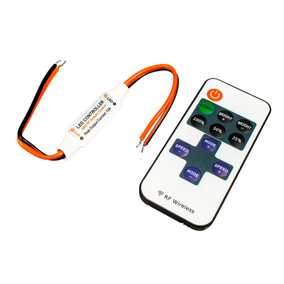 LED мини-диммер с пультом управления используется для включения/выключения и регулировки яркости светодиодных источников света, питающихся постоянным напряжением 12/24 В.
